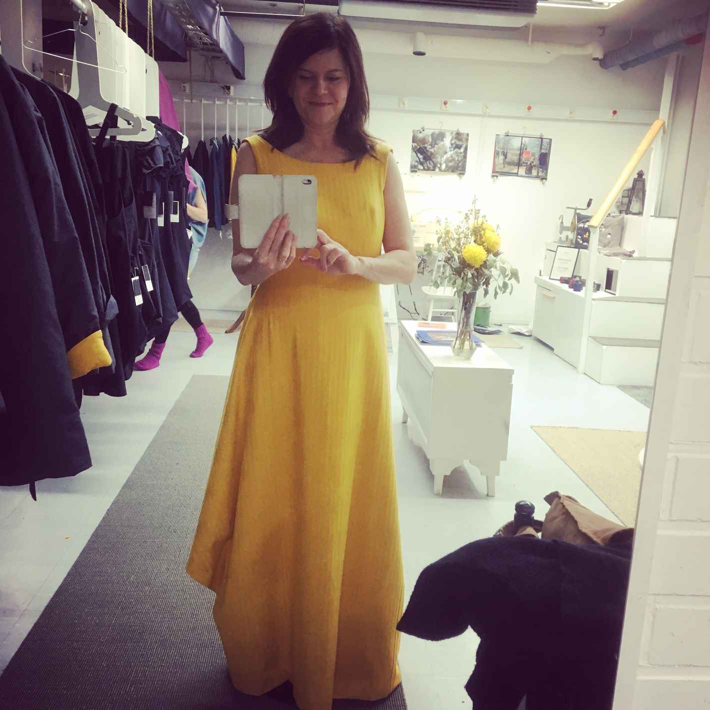 Saavun tänä vuonna itsenäisyyspäivän vastaanotolle kierrätetyistä materiaaleista valmistelussa puvussa. Auringonkeltainen puku on kierrätystekstiilejä hyödyntävän ekologisen TAUKO-vaatemerkin suunnittelijoiden Mila Moision ja Kaisa Rissasen käsialaa. Pukuni kangas on aikaisemmassa elämässään toiminut Imatran Valtionhotellin pöytäliinana. Nyt arvokas, alun perin valkoinen pöytäliina pääsee ylläni keltaiseksi värjättynä vielä arvokkaampaan ympäristöön eli presidentinlinnaan.